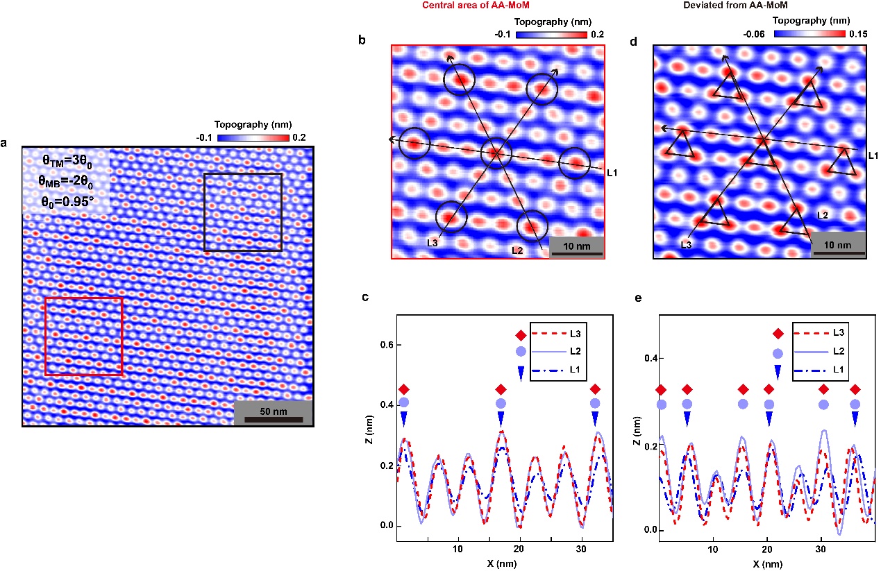 图2 | a, 典型的莫尔准晶样品的STM形貌图。b, a中红框区域,即超莫尔的AA区域的放大图。c, b中沿三个不同方向的高度变化图。d, a中黑框区域,即偏离超莫尔AA近100nm的区域的放大图。e, d中沿三个不同方向的高度变化图。