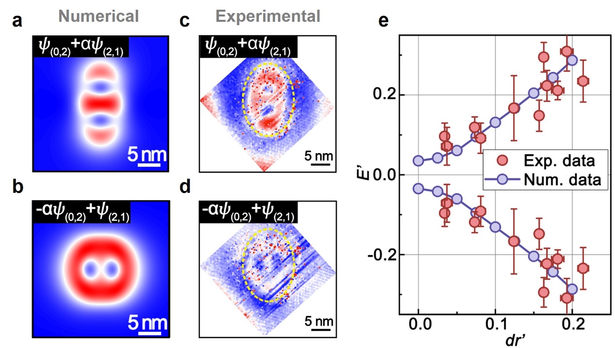 图2. (a,b)数值计算的杂化态(θ形和倒θ形)。(c,d)实验观测到的杂化态。(e)杂化态随量子点各向异性程度增加而发生能量劈裂。