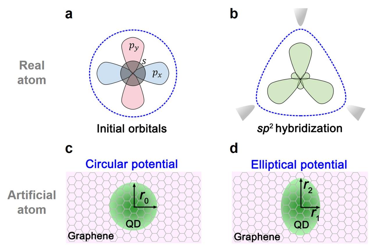 图1. 上半部分:真实原子中的(a)未杂化的轨道和(b)sp2轨道杂化示意图。下半部分:人造原子中的(c)圆形势场和(d)椭圆形势场示意图。